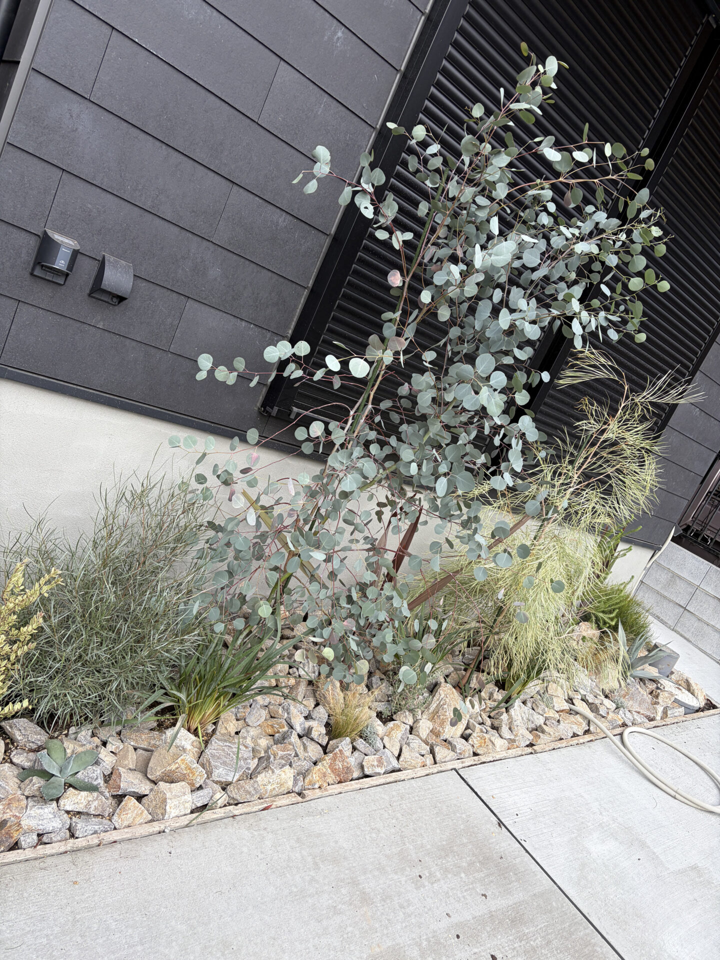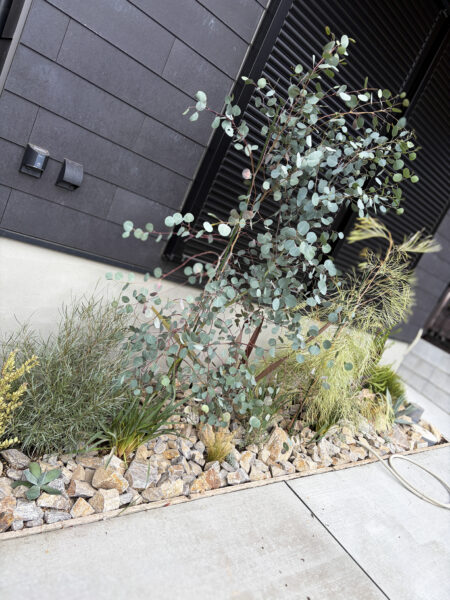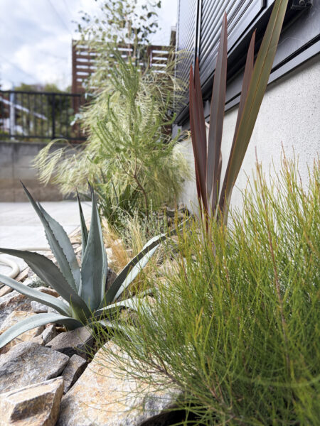 | DATA | 柱サボテンの植替え以来から始まった今回のご縁。 道路からよく見える”家の顔”を担当される奥様と、何度もやり取りを重ねデザインさせていただきました。 主木には、ユーカリとグレビレアを採用し、自然な枝ぶりとシルバーグリーンの葉色で、外構全体にやさしい動きと抜け感をプラス。 足元には、・バンクシア・アガベ・グラス類を組み合わせ、直線と曲線、硬さと柔らかさが自然に共存するできる風景に。 ロック材は色味を抑え、あえてナチュラルに配置することで、植物のフォルムや陰影が引き立つよう調整。 乾燥に強く、剪定や水やりの負担が少ない植物を選定しているため、 日常管理がしやすいナチュラルドライガーデンとして、長く楽しんでいただける外構に仕上げました。 |